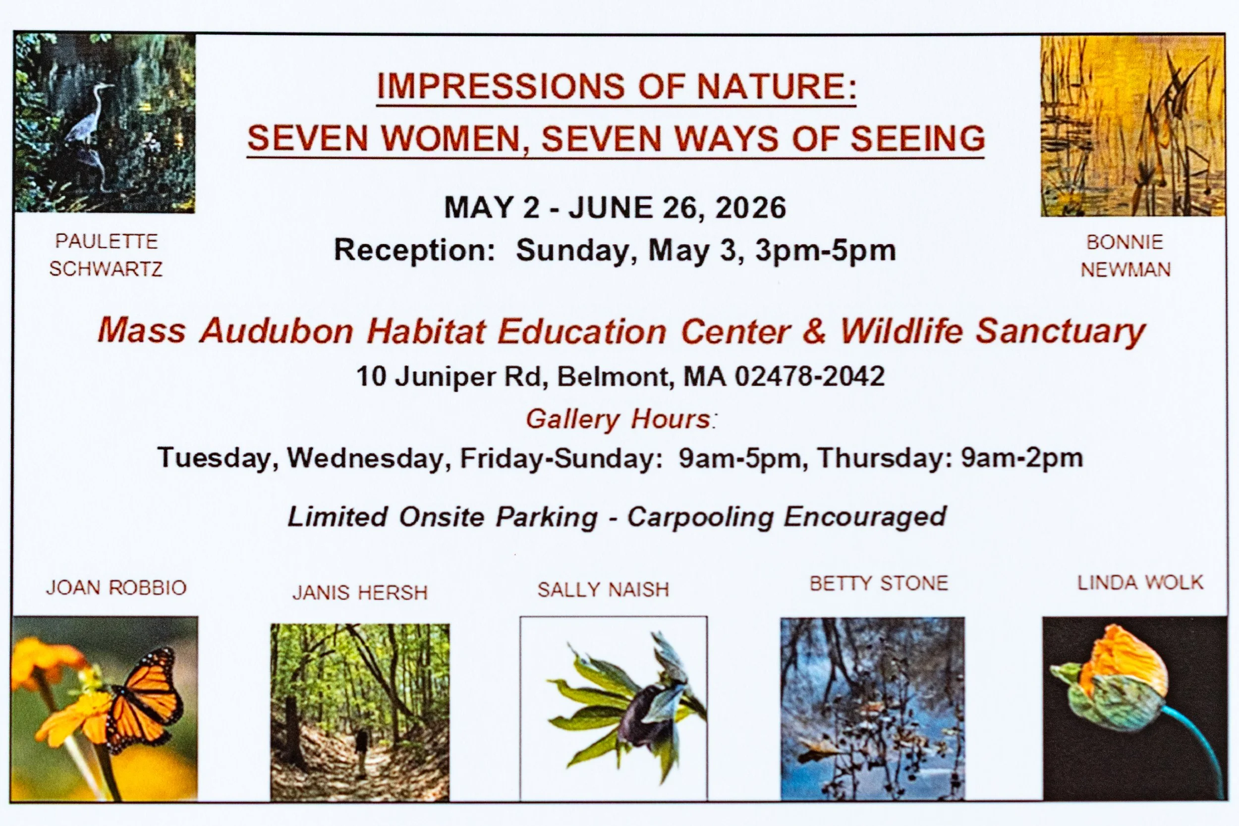 Join me and my fellow photographers at Mass Audubon’s Habitat Educational Center for an exhibit of our work: Impressions of Nature: Seven Women Seven Ways of Seeing. It’s up May 2 - June 26, 2026.